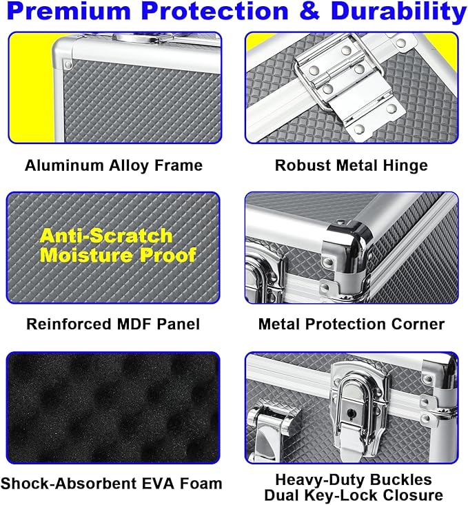 - **Premium Protection & Durability** Crafted with premium materials and precision engineering,rugged aluminum alloy frame, reinforced MDF panels, shock-absorbent EVA foam lining create a fortress card protection case on your collection against impacts, moisture, dust. Dual key-lock closures and heavy-duty buckles , built to preserve cards in pristine condition for years.