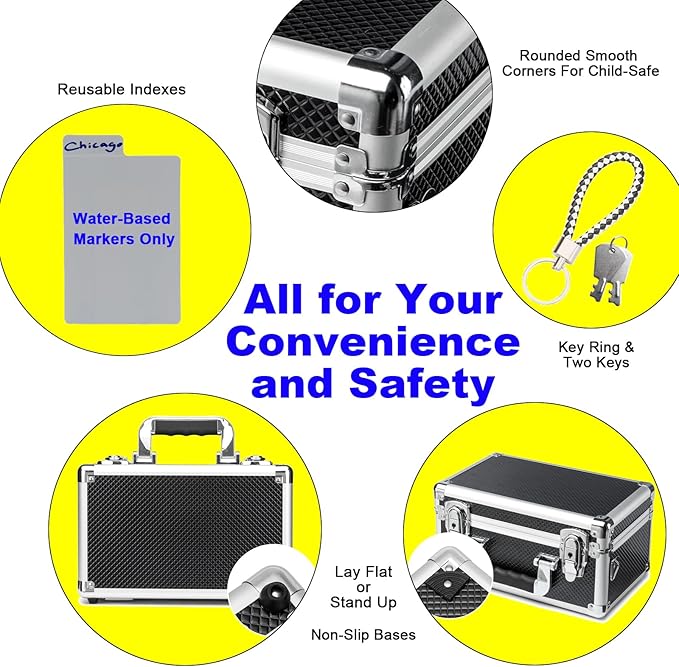 - **Thoughtful, User-Centric Features** - **Multi-Position Use:** Lay flat for easy access or stand it upright with non-slip base guards. - **Child-Safe Design:** Rounded, smooth corners protect against accidental bumps or scratches. - **Reusable Indexes:**PP writable/erasable index cards for quick labeling . - **Key Security:** Includes a key ring + spare key to prevent lockouts.