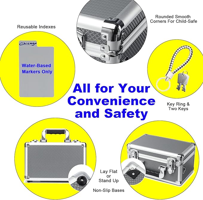 - **Thoughtful, User-Centric Features** - **Multi-Position Use:** Lay flat for easy access or stand it upright with non-slip base guards. - **Child-Safe Design:** Rounded, smooth corners protect against accidental bumps or scratches. - **Reusable Indexes:**PP writable/erasable index cards for quick labeling . - **Key Security:** Includes a key ring + spare key to prevent lockouts.