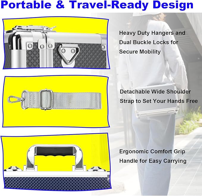 - **Portable & Travel-Ready Design** The ergonomic comfort grip handle ensure easy carrying,and the detachable, shoulder strap (color-matched for style) set your hands free. Dual reinforced buckle locks and shock-absorbent egg-crate foam secure cards during transit, this card storage box makes sharing and trading with more confidence.