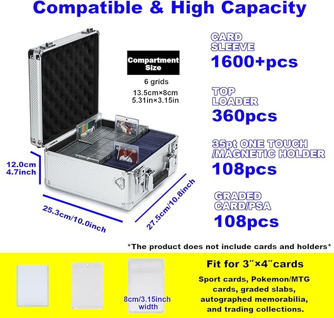 - **Premium Protection & Durability** Crafted with premium materials and precision engineering,rugged aluminum alloy frame, reinforced MDF panels, shock-absorbent EVA foam lining create a fortress card protection case on your collection against impacts, moisture, dust. Dual key-lock closures and heavy-duty buckles , built to preserve cards in pristine condition for years.