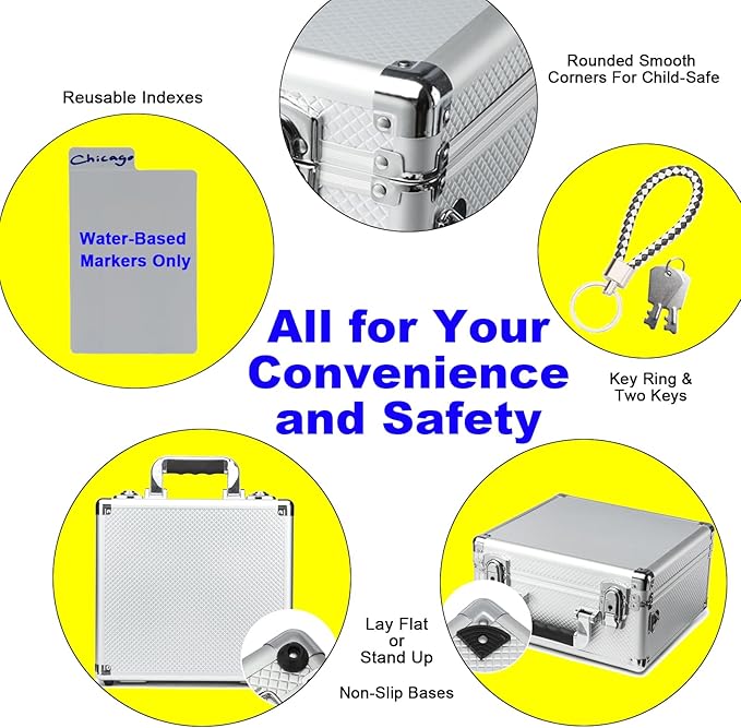 - **Thoughtful, User-Centric Features** - **Multi-Position Use:** Lay flat for easy access or stand it upright with non-slip base guards. - **Child-Safe Design:** Rounded, smooth corners protect against accidental bumps or scratches. - **Reusable Indexes:**PP writable/erasable index cards for quick labeling . - **Key Security:** Includes a key ring + spare key to prevent lockouts.
