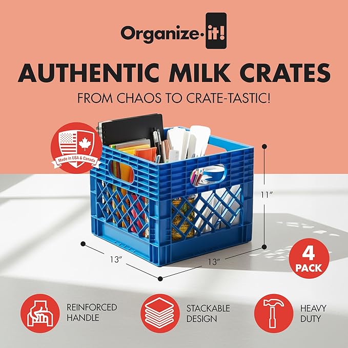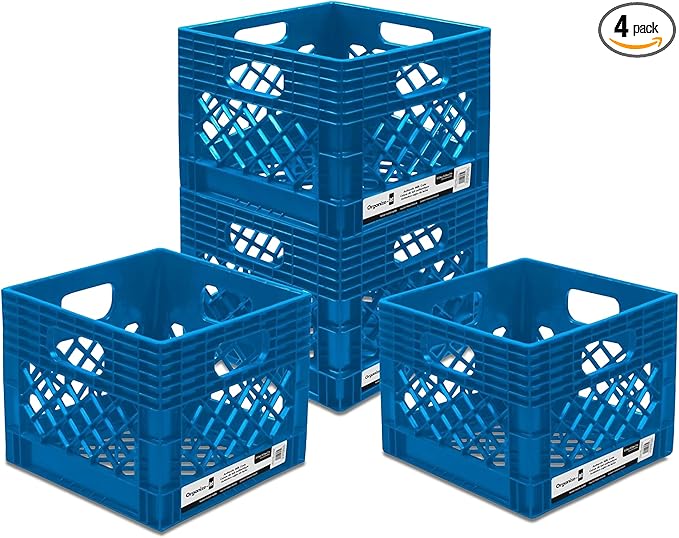 ORGANIZE-IT! 4 Pack Storage Milk Crate, Heavy Duty Versatile Box Organizers with Easy-Grip Handles, Interior 12.25"L x 12.25"W x 10.5"H, Blue