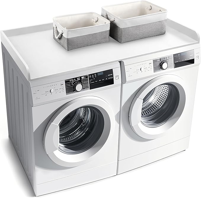 - SIZE AND COMPATIBILITY: With dimensions approximately 27.5 inches wide, 54 inches length and 3 inches depth with edge rails, this countertop is designed to seamlessly integrate with most washing machines. It provides a snug fit to protect the top surface effectively and also prevent clothing detergent etc. from falling off. Two additional storage baskets are provided for you to store dirty clothes or laundry supplies.