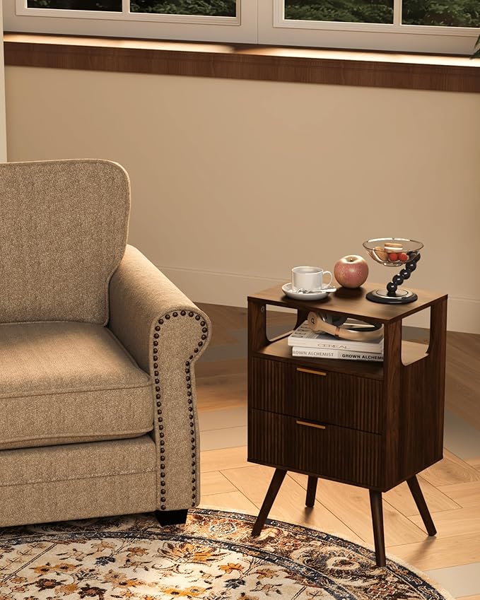 Nightstand,Modern Bedside Table with 2 Storage Drawer and Open Wood Shelf, for Bedroom and Small Spaces,Night Stand with Solid Wood Legs,Walnut Brown