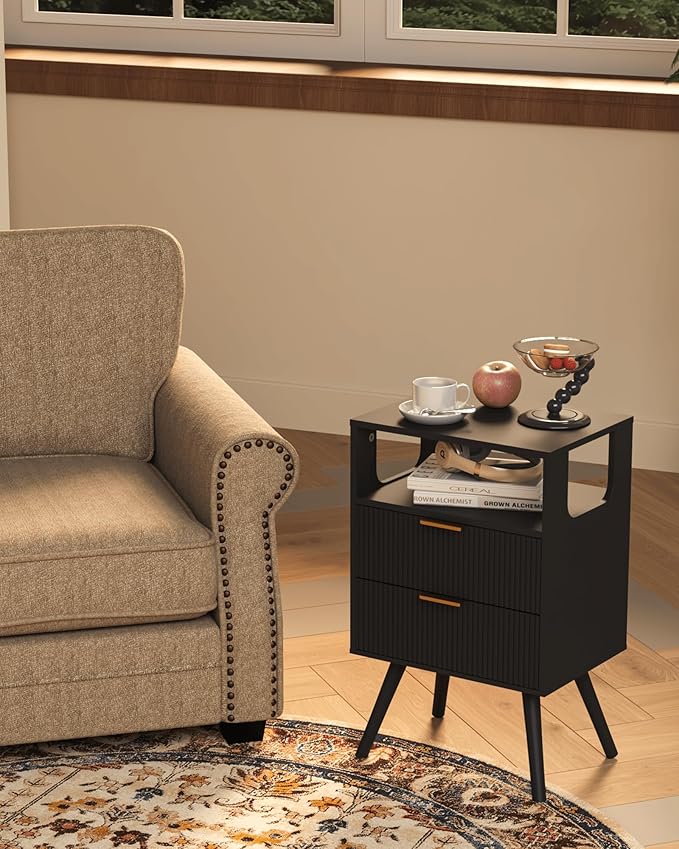 Black Nightstand,Modern Bedside Table with 2 Storage Drawer and Open Wood Shelf, for Bedroom and Small Spaces,Night Stand with Solid Wood Legs