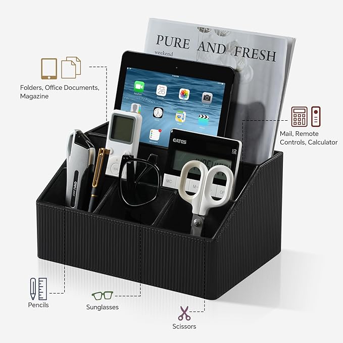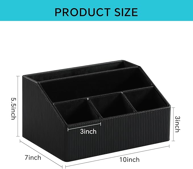 - Large Size —— Measuring 10” (L) x 7” (W) x 5.5” (H), this remote organizer provides ample space for tablets, pens, notebooks, remotes, and other daily essentials