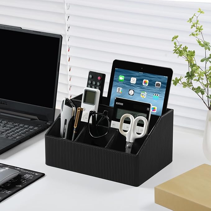 Remote Control Holder with 5 Compartments for Office Art Supplies, PU Leather Nightstand Organizer Pencil Pen Desk Caddy for Home, Desktop TV Remote Control Organizer Storage (Striped Black)
