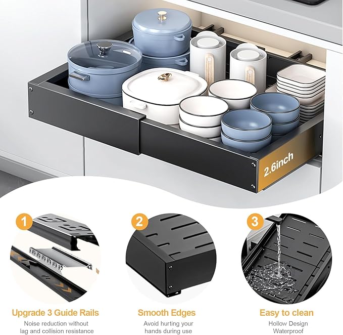 - Strong Load Bearing: Made of carbon steel and 3 widen damping guide sliding rails, this pull-out cabinet shelf features heavy duty