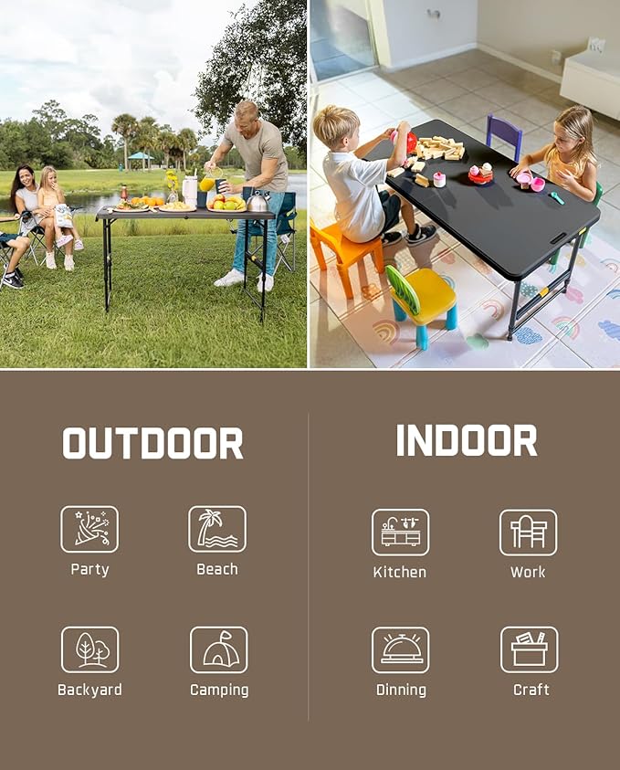 FanttikOutdoor 4ft Portable Folding Table, One-Handed Height Adjustment, 4 Heights, Gravity Lock, Carry Handle, Indoor Outdoor Heavy Duty Fold-in-Half Utility Table, Party, 1 Pack, Black Zeta X4 Pro