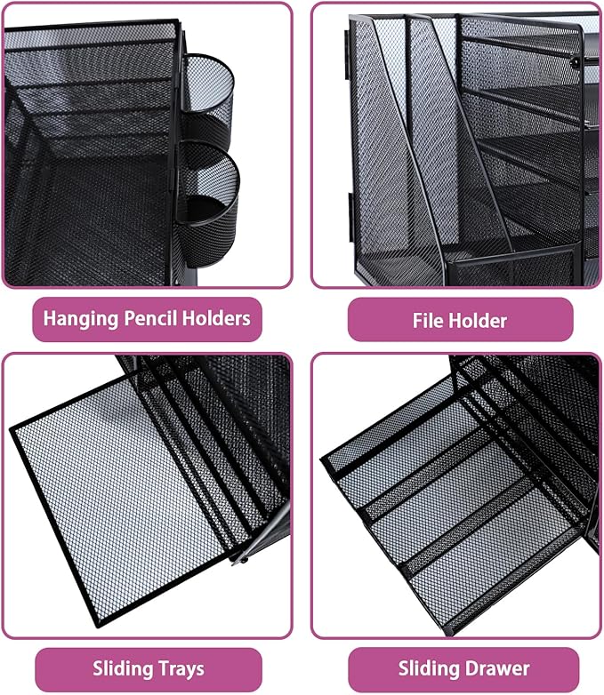 - 📚Improve Work Efficiency: It owns 3 sliding trays+1 file holder+2 pen holders+1drawer. Our file organizer is enough to complete the tidy of desktop documents and maximize the utilization of space