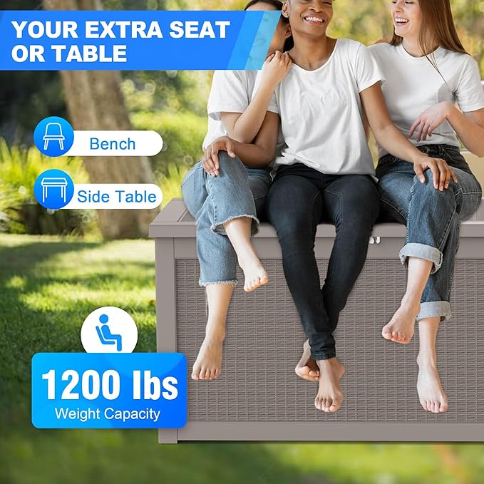 - Versatile Storage with Large Capacity Our deck box offers an impressive storage capacity, perfect for organizing patio cushions, gardening tools, pool accessories, and more. This multipurpose storage solution not only helps keep your outdoor space tidy but also functions as a bench or table. Whether in your backyard, by the pool, or on the patio, this deck box is designed to meet your every need.