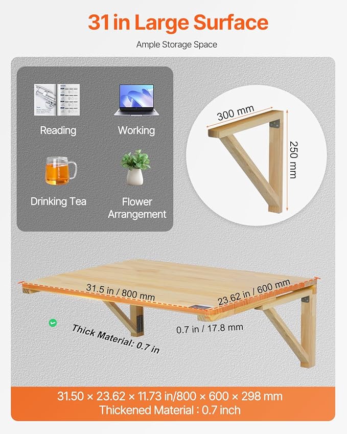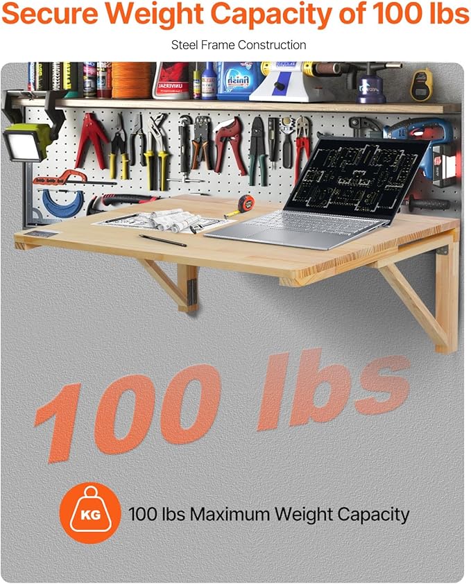 - 100 lbs High Load Capacity: Despite its compact size, this wall-mounted desk supports up to 100 lbs due to its 0.7-inch thick material. It remains stable for a variety of items, from small and large tools to laptops, heavy books, and decor, keeping everything securely in place