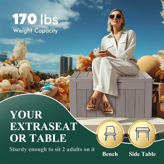 - All-Weather Outdoor Storage Box : UV-resistant resin laughs off sun, rain, and snow without fading or cracking. Perfect for patio cushions, gardening tools – keeps everything dry and organized season after season.