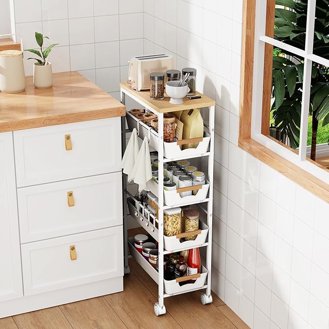 5-Tier Slim Storage Cart, Wooden Top Rolling Kitchen Cart with Pull-Out Baskets & Wheels, Narrow Space Utility Cart Slide Out Organizer for Kitchen, Bathroom, Laundry Room, White