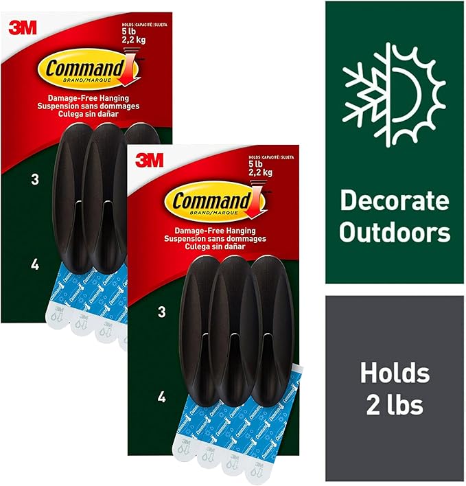 Command Outdoor Large Hooks, Bronze, Holds up to 5 lbs, 6-Hooks, 8-Strips, Damage Free Hanging Wall Hooks for Hanging Outdoor Wall Decor with Weather