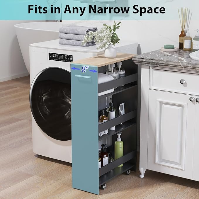 - 【Space-Saving Storage Cart】Compact 8-inch width, this thin rolling cart maximizes vertical storage for kitchens, bathrooms, laundry rooms, or narrow spaces.