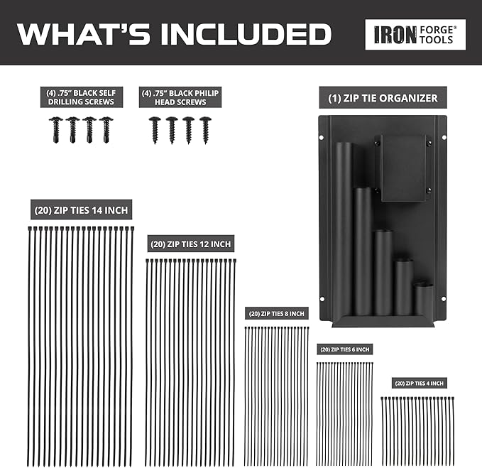 Iron Forge Tools Zip Tie Holder, Cable Tie Organizer for Enclosed Trailer Storage, Work Truck, Race Trailer & Garage Organization. Wall Mounted, Black Powder Coated Steel, Includes Mounting Hardware