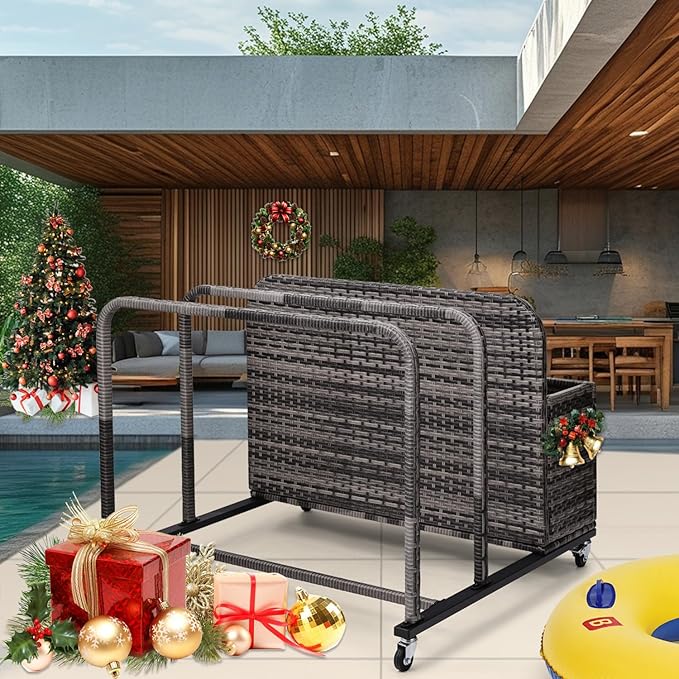 Poolside Float Storage Organizer,Pool Toy Storage Holder with Wicker Basket Outdoor Pool Float Holder Rack Rolling Poolside Caddy Cart Raft Rack for Pool Noodle Equipment Mixed Grey