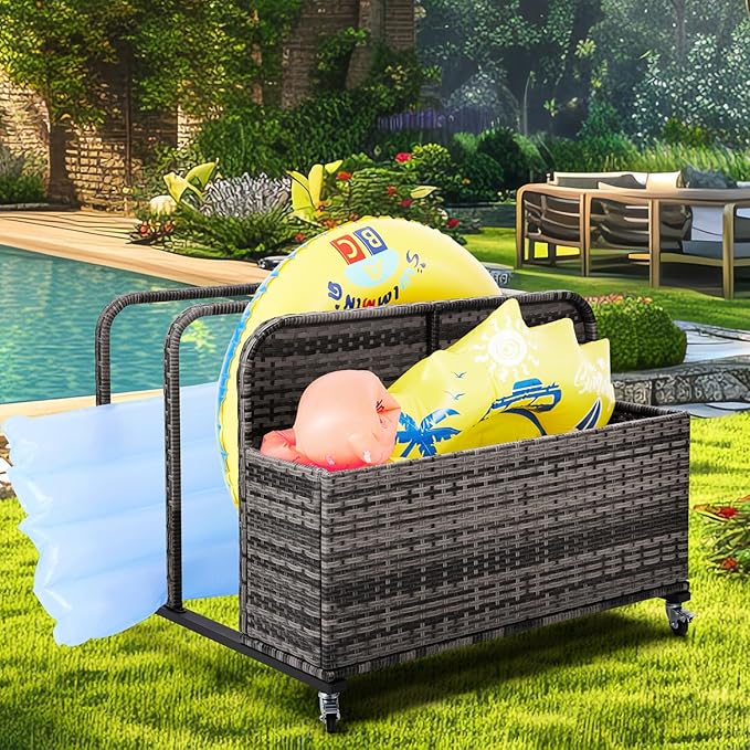 - 【Flexible Movable & Elevated】Pool toy holder storage comes with 2 universal wheels and 2 locking wheels, make this Pool toy holder storage easy and quick to move or transport pool floats,garden tools,pool toys and other accessories to the beach or outside from one place to place around your pool,lawn,deck,count-yard, two locking wheels ensure stability, lock in place and enjoy your fun, the elevated bottom design to ensure the bottom dry and clean