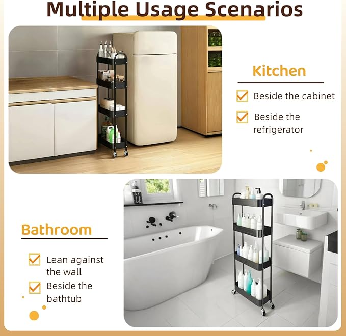 - 【Easy to Assembly】The four tiered narrow black rolling cart can be easily assembled by following the manual and even a first-time user can complete the setup in under 10 minutes