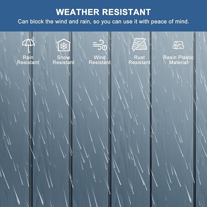 - Resin Materials: This storage shed constructed from high-quality resin, the item offers exceptional durability, enabling it to withstand various outdoor weather conditions, including UV rays, humidity, and temperature fluctuations.