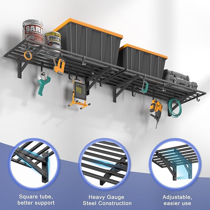 - PREMIUM STRENGTH & STABILITY: Engineered with heavy-duty steel, our wall shelf system features reinforced square tube supports, a seamless integrated frame, and secure U-hooks for superior durability. Every component undergoes rigorous quality testing to ensure maximum safety and long-lasting performance