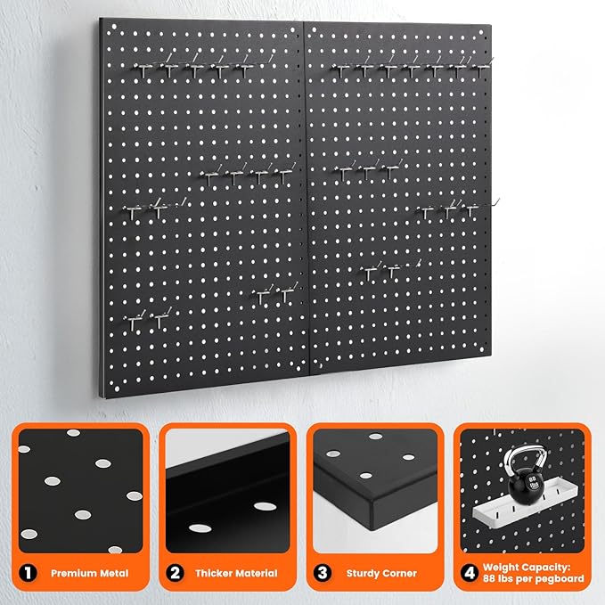 - Premium Material: ENJOYWOOD 2-pack metal pegboard is made of premium steel and is sturdy and durable. A single piece can bear up to 88lbs. The surface of the peg board is sprayed with a powder coating, with a high adhesion surface treatment, no paint loss, moisture-proof and rust-proof.