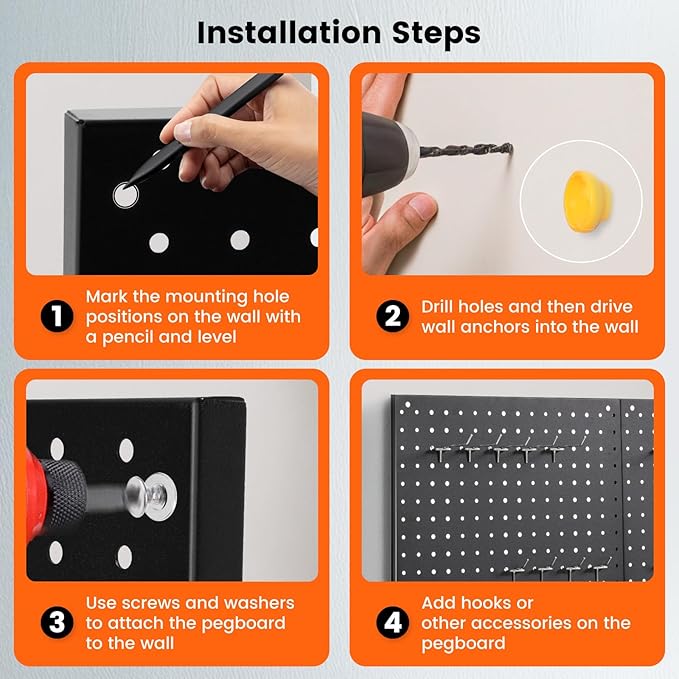 - Easy to Install: ENJOYWOOD 2-pack metal pegboard panel comes with installation accessories: 8 screws, 8 washers and 8 wall anchors. You only need to use auxiliary tools such as drills and hammers to install them. This pegboard wall organizer is equipped with 15 pieces of 1.5 in short hooks and 15 pieces of 3 in long hooks to meet your daily storage needs.