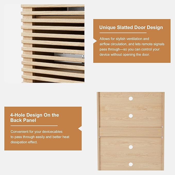 - 【Durable Build with Mobility】Crafted from premium engineered wood with a realistic wood grain finish, this modern wooden stereo cabinet offers reliable structure and stability. Four smooth-rolling wheels make repositioning effortless—ideal for dynamic home setups.
