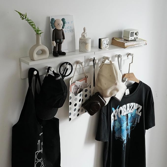 Entrance Coat Rack ,Coat Hooks, Wall-Mounted Wooden Hook Rack, Wall-Mounted Shelves are Very Suitable (White Finish-2)