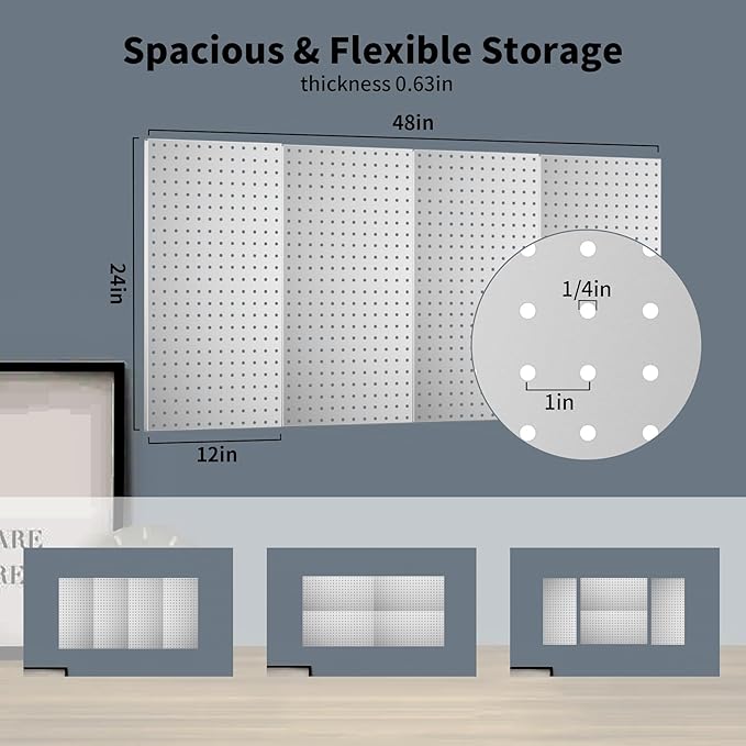 - Product Size: The set includes 4 metal pegboard panels (24" x 12") and mounting screws (excluding nail hooks), which can accommodate 1/4" hooks and accessories