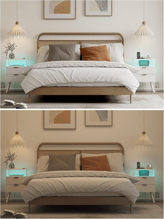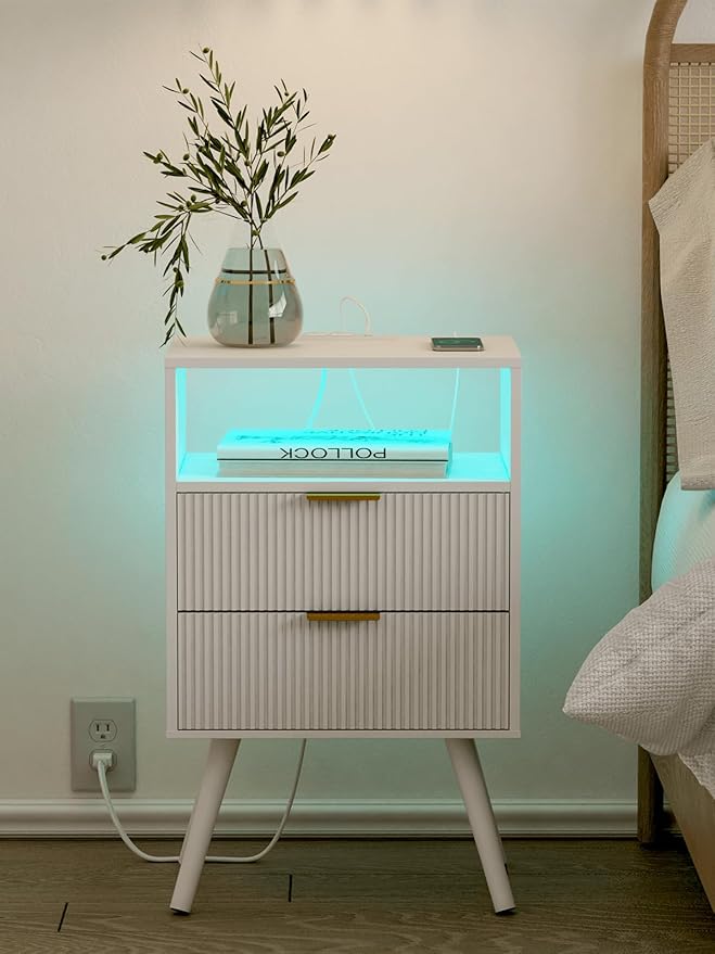 Nightstand with Charging Station and LED Lights, Modern Bedside Table with 2 Storage Drawer and Open Wood Shelf for Bedroom and Small Spaces, Night Stand with Solid Wood Legs