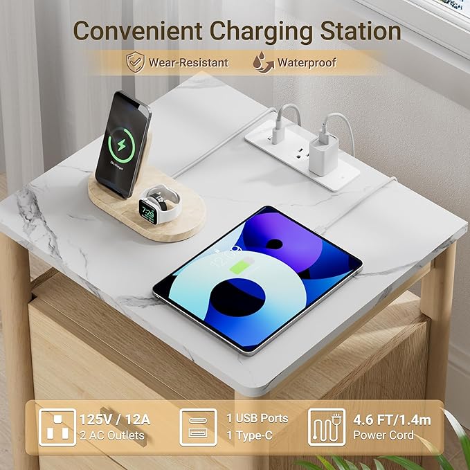 - ⭐Built-In Charging Station: This charging nightstand comes with an ETL & FCC-certificated charging station, equipped with 2 AC outlets (125V) and 1 USB + 1 Type-C port (5V/2A). A circular hole on the back enables cable management, keeping the nightstand countertop tidy and providing convenience for charging devices like phones, tablets, headphones, desk lamps, etc.