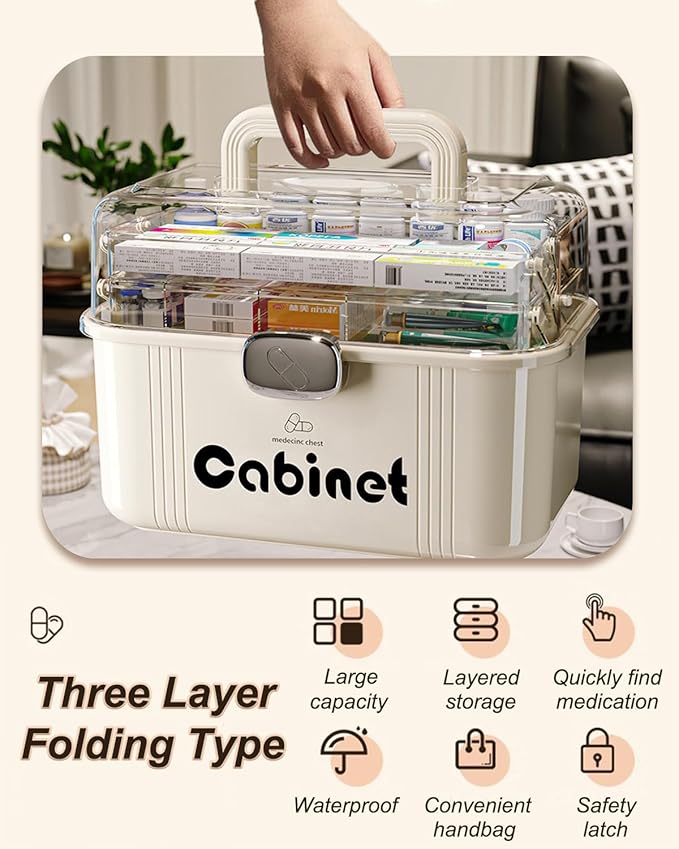 3-Tier Folding Medicine Cabinet Organizer with Handle, Clear Portable Medicine Storage Box for Home, Multifunctional First Aid Caddy with Secure Latches, Large Capacity Medical Supply Organizer