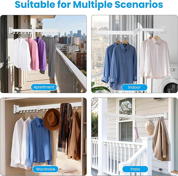 - 【Multi-Purpose Laundry Solution】More than a foldable drying rack; it’s a complete laundry accessory system. Use it for air-drying clothes indoors, organizing laundry rooms, hanging plants, or as a retractable clothesline alternative in apartments, ensuring quick drying and efficient space use