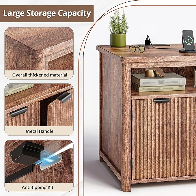 Fluted Nightstands Set of 2 with Charging Stations, 23.6" Wide Walnut Nightstand with Storage Drawers, Side Tables, Modern Farmhouse End Tables for Bedroom, Walnut Brown