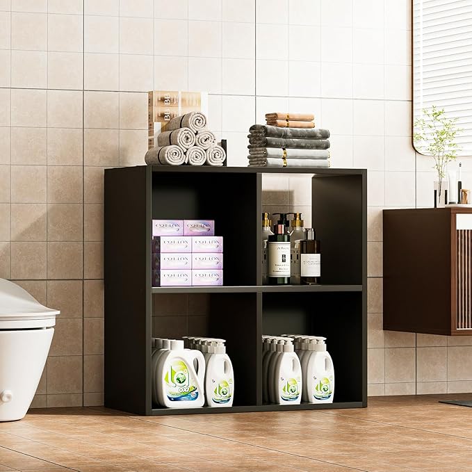 COMHOMA 4 Wood Cube Storage Organizer with Open Back and Removable Back Panels, 11In Black Cube Storage Bookshelf, Cubicle Shelf Bookcase for Home Office Bedroom Living Room, Vertical or Horizontal