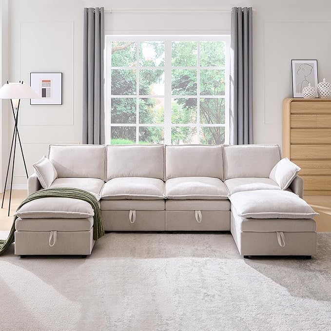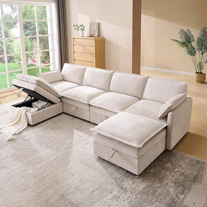 116.54" Sectional Couches for Living Room, Cloud Couch Sectional with Large Storage, U-Shape Modular Sectional Sofa with Ottoman,6 Seater Chenille Sofa with Pillow for Apartment, Bedroom, Beige