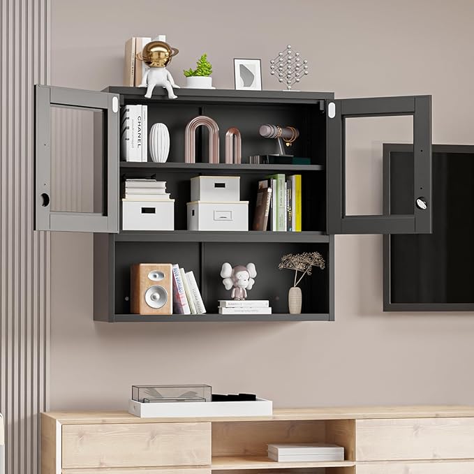 VINGLI Metal Wall Cabinet with Locking Glass Doors, Adjustable Shelf, Wall Mounted Storage Display Cabinets for Garage, Kitchen, Home Office, Warehouse, Living Room, Black