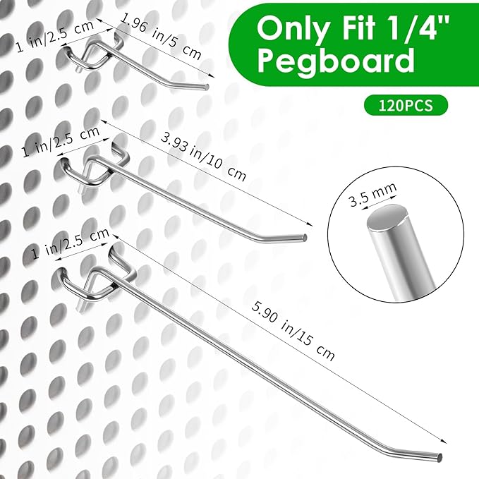 - 【Package Included】This set includes 120 durable pegboard hooks. These hanging hooks are perfect for everyday use, replacements, or sharing. The pegboard hooks perfectly for organizing and storing a variety of household cleaning supplies, hand tools, storage tools, and more.