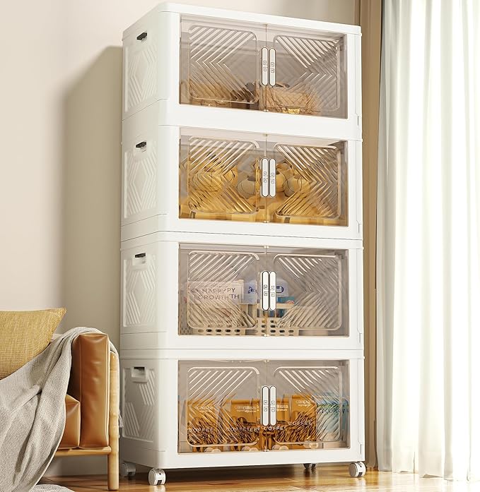 - 【Double Door & Visual Design】The storage boxes can be opened from the front doors and the top lid, 2 opening ways are convenient for retrieving items from different directions. The top lid makes it easy to quickly access large items, such as clothes and blankets. Powerful magnets are built into the front door to ensure that it will not automatically open. The door is made of transparent material, making the clear storage bins visible, so you can quickly find the items you need and save your time