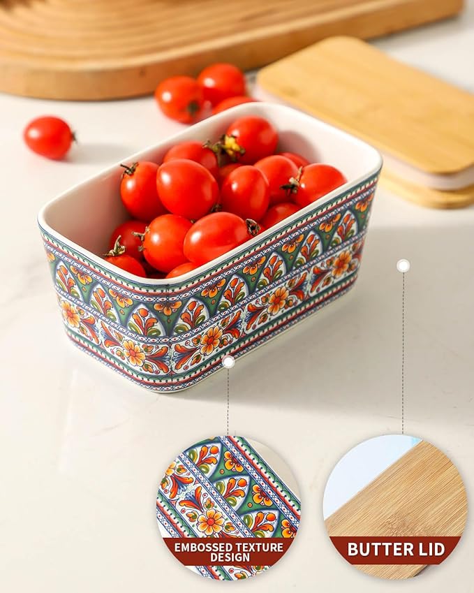 - Bold Bohemian Green Design: The butter dish showcases an intricate embossed pattern in a striking Bohemian green, offering an artistic touch for your countertop. This lidded butter dish combines daily functionality with the appeal of a decorative statement piece