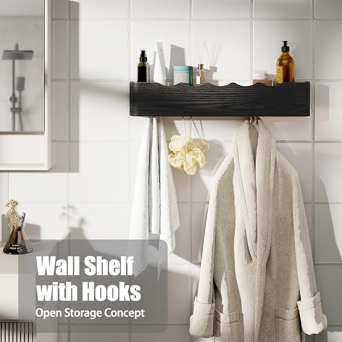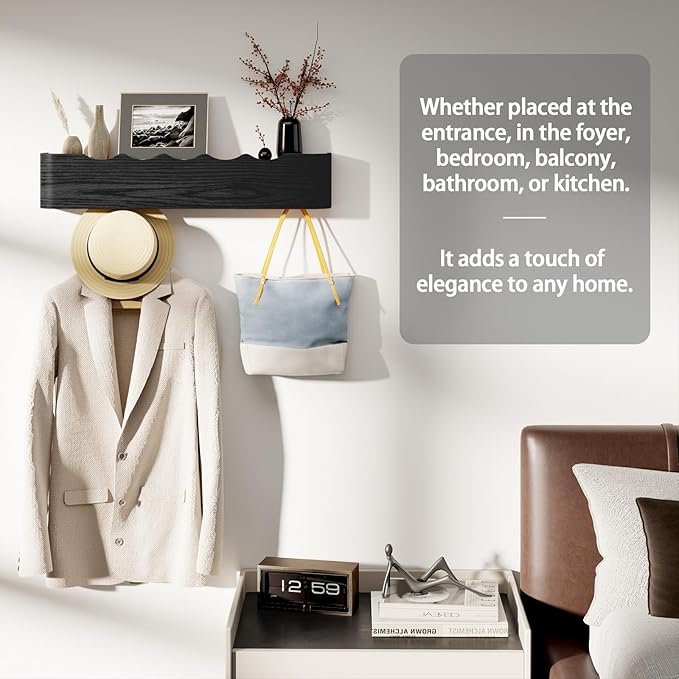 Coat Rack Wall Mount with Shelf 4 Hidden Hooks Modern Wooden Key Holder Entryway Organizer for Hallway Bedroom Bathroom Home Decor Storage for Hanging Coats Hats Bags Towels, Wave-Shape Black