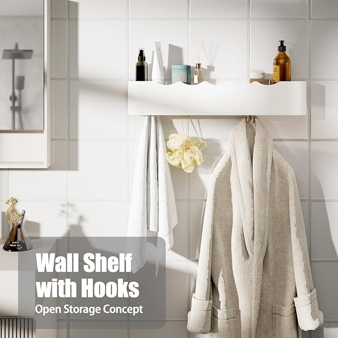 Coat Rack Wall Mount with Shelf 4 Hidden Hooks Modern Wooden Key Holder Entryway Organizer for Hallway Bedroom Bathroom Home Decor Storage for Hanging Coats Hats Bags Towels, Wave-Shape White