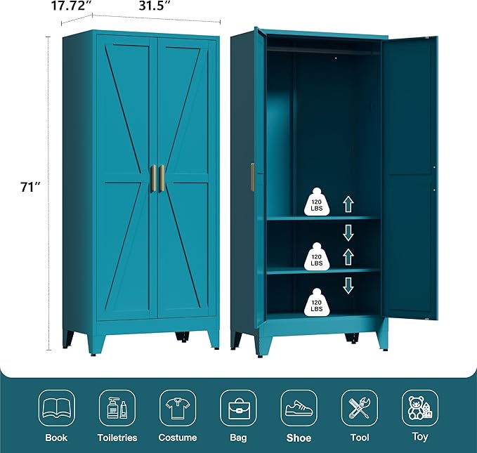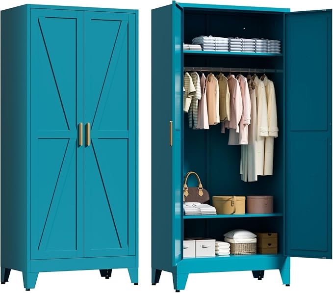 - Rustic Farmhouse Design: The door panels of this metal wardrobe feature a charming farmhouse design, blending traditional elegance with modern practicality. The aesthetic appeal of the cabinet makes it both a functional and decorative piece