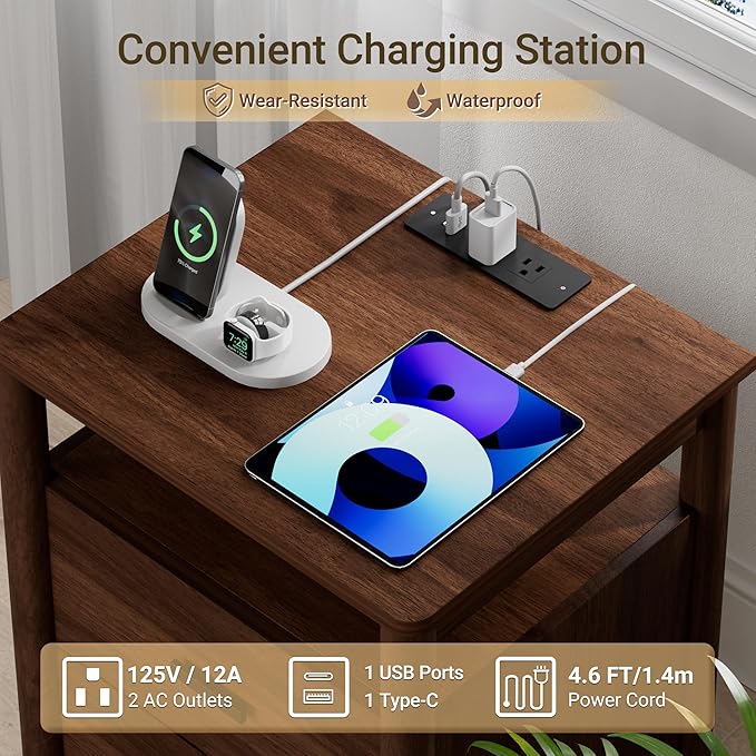 - ⭐Built-In Charging Station: This charging nightstand comes with an ETL & FCC-certificated charging station, equipped with 2 AC outlets (125V) and 1 USB + 1 Type-C port (5V/2A). A circular hole on the back enables cable management, keeping the nightstand countertop tidy and providing convenience for charging devices like phones, tablets, headphones, desk lamps, etc.