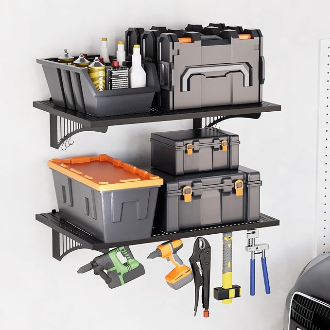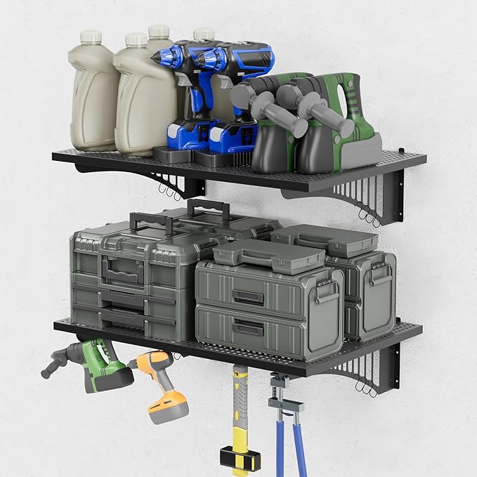 - π― Maximize Your Wall Space: Each set includes TWO massive 2x3ft shelves and SIX bonus hooks, tripling your vertical storage potential. This wall shelves heavy duty system is ideal for garages, basements, and utility rooms. Keep everything from power tools and paint cans to holiday decorations and bulk supplies perfectly organized and off the floor.