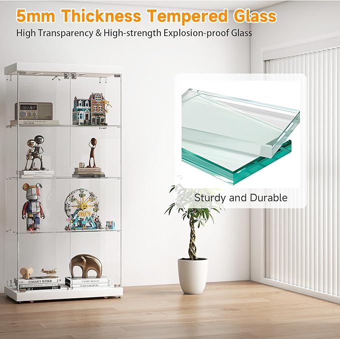- 【Durable 5mm Thick Tempered Glass】This curio cabinet is constructed with 5mm thick tempered glass and wood boards, offering both durability and style. The tempered glass enhances safety by reducing breakage risks, while the wood board surface is easy to clean and long-lasting. With a weight capacity of up to 250 lbs, it's ideal for showcasing your cherished items