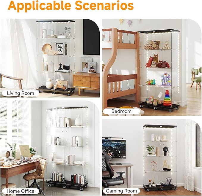 - 【Multi-Color Light Strip】This stylish glass display cabinet comes with a LED light strip that can be controlled via remote or app. Powered by a USB connection, it offers multiple color options to suit your mood and environment. Effortlessly create a warm, romantic, or festive atmosphere, while beautifully showcasing your cherished items